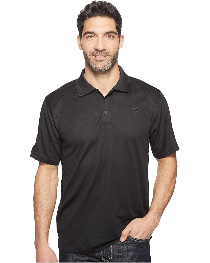 A clean style is found in this Ariat® polo.SKU: #8330655Polyester fabrication offers quick-dry properties to keep you cool and comfortable.Contrast mesh panels at underarms. Ribbed polo collar.Embroidered brand logo featured at left chest and back yoke.Three-button placket.Short sleeves with raglan seaming for greater ease of movement.Straight hem.100% polyester.Machine wash cold, tumble dry low.Imported.Product measurements were taken using size MD. Please note that measurements may vary by size.Measurements: