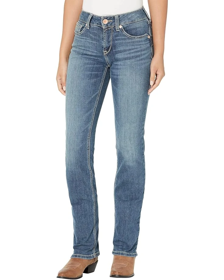 Get a chic choice that adapats to your everyday needs by adding Ariat® R.E.A.L. Perfect Rise Daphne Straight Jeans to your collection.SKU: #9700220Regular fit.Pull-on style.Waistband with loops.Front zip-fly and button closure.Classic five pockets.Full-length slightly flared legs.Washed effect.95% cotton, 4% elasterell-p, 1% lycra® spandex.Machine wash, tumble dry.Imported.Product measurements were taken using size 26, inseam R. Please note that measurements may vary by size.Measurements: